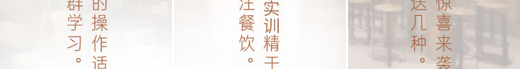 • 教學優勢: 手把手技術指導 真材實料操作 不控制原料設備 配方公開 技術支持與咨詢 隨到隨學 名師團隊指導 8年專注餐飲教育 學員遍布100+城市 不控制任何原料及設備