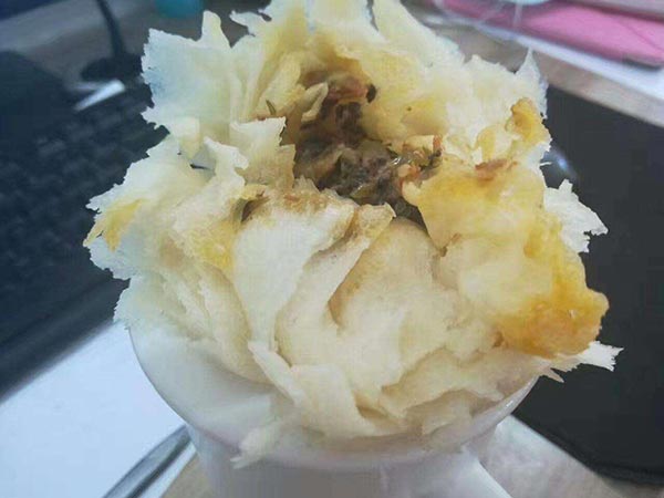 破酥包子是 昆明的傳統風味小吃,是由低筋精白面粉、熟豬油、熟云腿、蜂肉丁、冬菇末等制成。破酥包子含有蛋白質、碳水化合物、維生素,營養豐富,老少皆宜。由于這種包子負有盛名,現在已經從民間小飯館或大排擋,走進了昆明市的各大賓館飯店,幾乎在各種高檔筵席、宴會、自助餐、風味餐中都能夠品嘗到破酥包子。